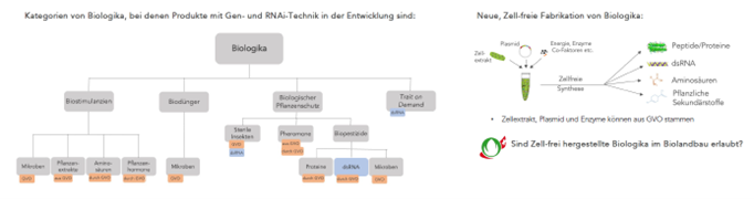 Gentech-Mikroben (Bakterien) kommen auch auf dem Feld zum Einsatz: als sogenannte Biologika. Der Sammelbegriff "Biologika" umfasst Biostimulanzien, Biodünger und biologische Pflanzenschutzmittel. Sie haben gemeinsam, dass sie aus Lebewesen oder aus Wirkstoffen von natürlichen Quellen bestehen. Mit den Biologika wollen die Konzerne ihre chemisch-synthetischen Portfolios ergänzen. Die Innovationen in diesem Bereich treiben sie mit dem Einsatz von neuer Gentechnik, Künstlicher Intelligenz, Nano- und RNAi-Technik voran. Biologika, bei denen Gentechnik zum Einsatz kommt sind im Bild orange markiert.